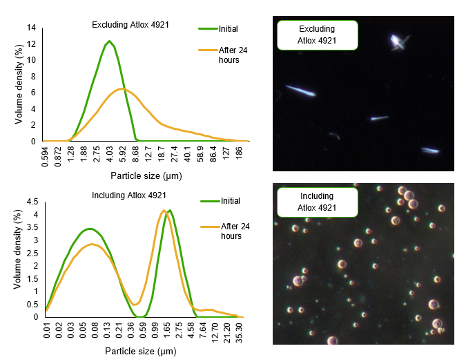 The Pendimethalin DC formulated without Atlox 4921 exhibits a stark increase in particle size on dilution, whereas the Pendimethalin DC formulation containing Atlox 4921 maintains active ingredient particle size over a 24-hour period. This demonstrates the effect of including Atlox 4921 to stabilise the active ingredient crystals on dilution.
